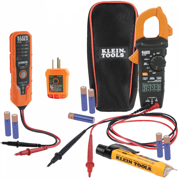 Multímetro digital de gancho con cables de prueba (CL120), probador de voltaje sin contacto de doble rango con linterna (NCVT3P), probador de voltaje CA/CD para uso electrónico (ET40), probador de receptáculo GFCI (RT210), estuche para transporte, instrucciones y todas las baterías necesarias