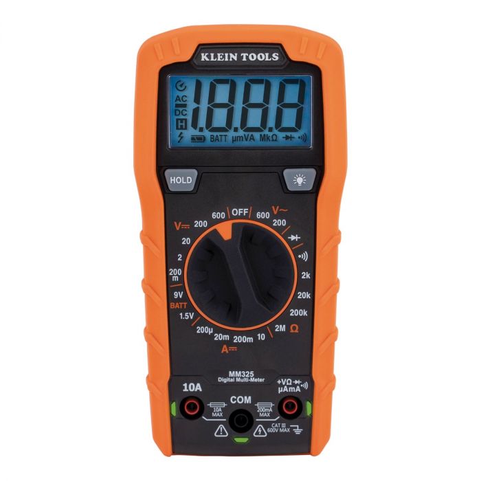 El MM325 de Klein Tools es un multímetro de rango manual que mide voltaje CA/CD, corriente CD y resistencia. También sirve para probar baterías, diodos y continuidad. La línea de productos de prueba y medición de Klein Tools está diseñada exclusivamente desde el inicio por electricistas, para electricistas. Los años de investigación en el campo combinados con el amplio aporte de los electricistas de todo Estados Unidos sirvieron de inspiración para el desarrollo de medidores y probadores eléctricos que ofrecen características innovadoras, que permiten ahorrar tiempo.