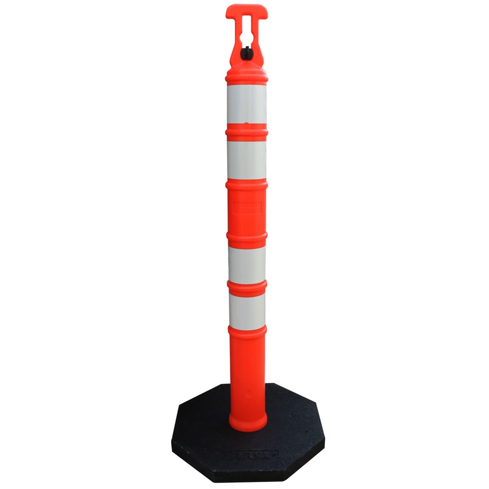 Descripción: Poste anaranjado con base negra y cuatro cintas reflejantes para delimitar áreas y señalar obras en construcción
